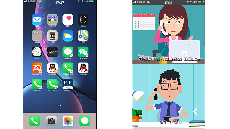 本系統(tǒng)運用了虛擬仿真技術(shù),模擬手機操作系統(tǒng),將9大常見詐騙案例,通過手機應(yīng)用圖標的方式,展示 給體驗者,并能觸發(fā)對應(yīng)的案例。案例包含:冒充管理人員、冒充熟人詐騙、虛假中獎、交友詐騙、刷單詐騙、QQ視頻詐騙、網(wǎng)上交易詐騙、金融詐騙、P2P 詐騙案例;體驗者在體驗案例的過程中,將遇到一些重要的選擇,并將引導(dǎo)你進入之后的情節(jié),最后將有虛擬民警,講解防范此類詐騙的技巧和要點。