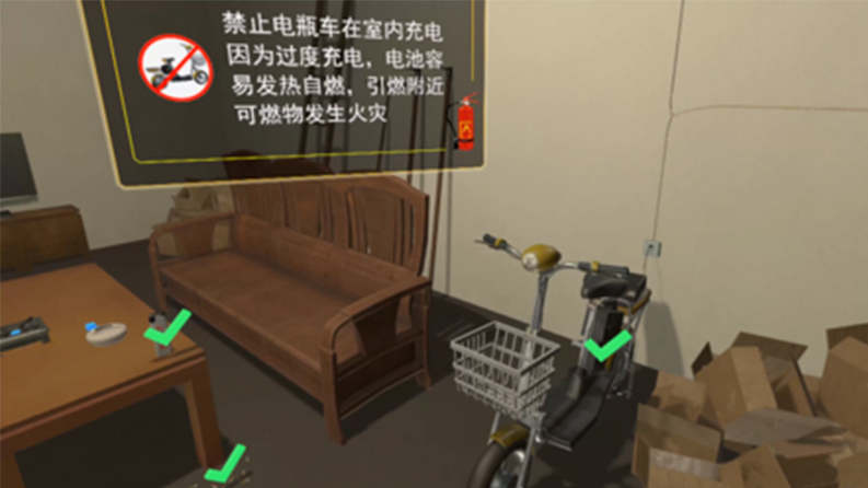 農(nóng)村建筑大多為毗連結(jié)構(gòu),屋內(nèi)木質(zhì)物品較多,極易點燃。體驗者需根據(jù)提示,找出容易引起火災的物品和生活習慣,然后在模擬發(fā)生火災時如何逃生。