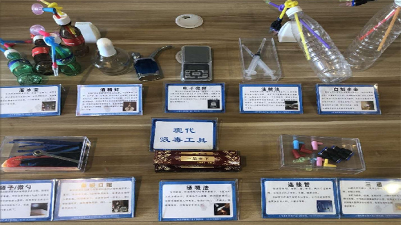 9種現(xiàn)代工具:電子秤、酒精燈、溜冰壺4個、錫紙、吸管、連接管、三通 鑷子/微勺、鼻吸口服、注射法。