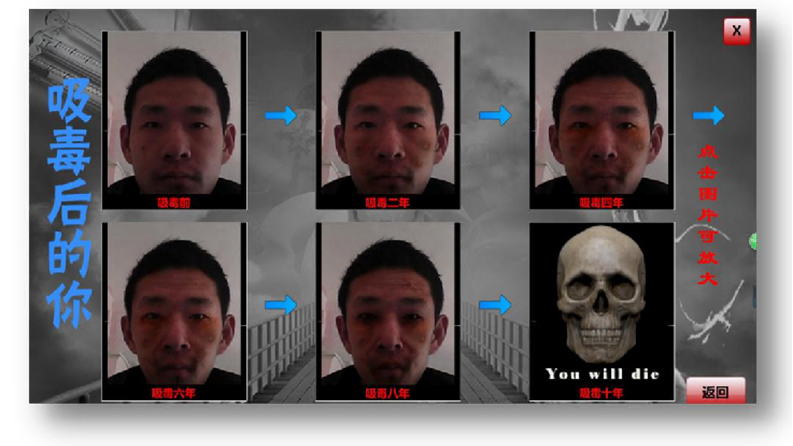 ★在屏幕上就會分別出現(xiàn)吸毒2年、吸毒4年、吸毒6年、8年后的吸毒面部變化。