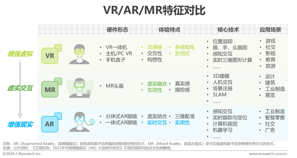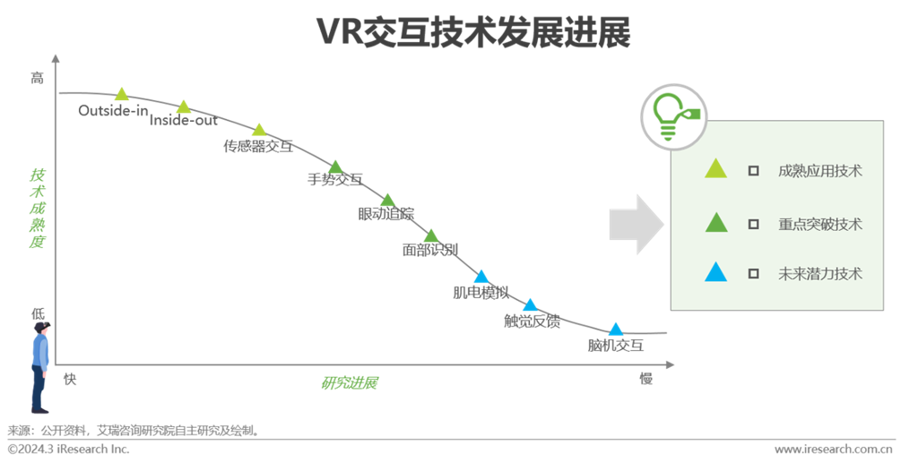 虛擬現(xiàn)實(shí)概念源于科幻小說,由任天堂等游戲廠商開啟商業(yè)化之路。早期設(shè)備成本高,技術(shù)成熟度有限,游戲廠商的嘗試都宣告失敗。2016年是虛擬現(xiàn)實(shí)的元年,硬件巨頭消費(fèi)級產(chǎn)品的推出,疊加中國眾多VR創(chuàng)企大力進(jìn)軍硬件端與內(nèi)容端,短期市場呈爆炸式增長。但行業(yè)整體處于民用初期,受內(nèi)容稀缺、設(shè)備易眩暈、屏幕清晰度差等影響,消費(fèi)級市場整體發(fā)展放緩。伴隨行業(yè)技術(shù)日趨成熟與產(chǎn)業(yè)玩家的擴(kuò)容,行業(yè)在2020-2022年邁入發(fā)展的關(guān)鍵階段,Quest銷量迎消費(fèi)級拐點(diǎn)。2023年蘋果Vision Pro發(fā)布,其對全新交互方式的實(shí)踐為業(yè)內(nèi)玩家?guī)硇碌乃伎肌W鳛楝F(xiàn)階段頂配產(chǎn)品,Vision Pro的出現(xiàn)不僅極大拉動(dòng)虛擬現(xiàn)實(shí)產(chǎn)業(yè)玩家信心,同時(shí)在市場激起的“浪花”,為行業(yè)帶來更多關(guān)注。艾瑞認(rèn)為,在可預(yù)見的27~28年,蘋果二代甚至三代產(chǎn)品將貢獻(xiàn)下一個(gè)里程碑,為產(chǎn)業(yè)帶來新的爆發(fā)。