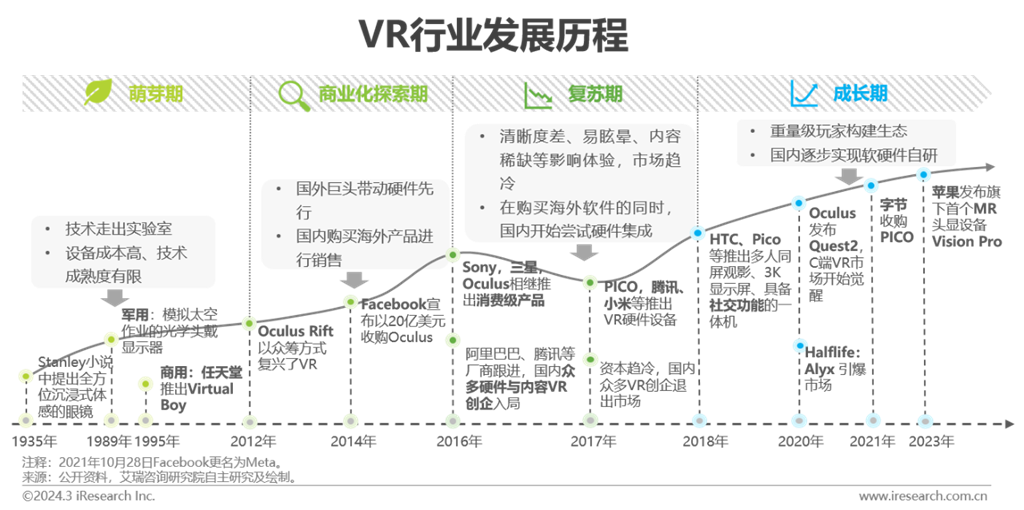 發(fā)展階段:新舊玩家推陳出新,特別是Vision Pro產(chǎn)品的問世,極大帶動(dòng)行業(yè)參與者信心,行業(yè)未來發(fā)展方向漸進(jìn)明晰,新品層出不窮,VR邁入快速成長期