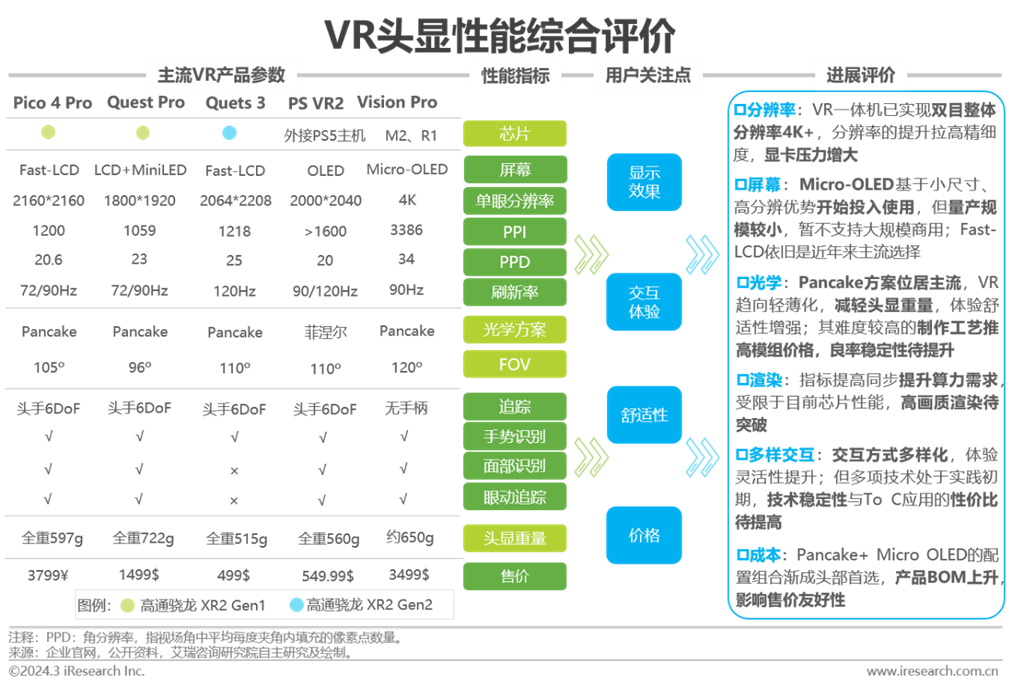 技術(shù)側(cè):核心芯片、顯示屏幕、光學(xué)方案、交互技術(shù)等均有突破,但VR硬件整體性能美中不足,算力、清晰度、產(chǎn)品良率、交互靈活性等仍有提升空間