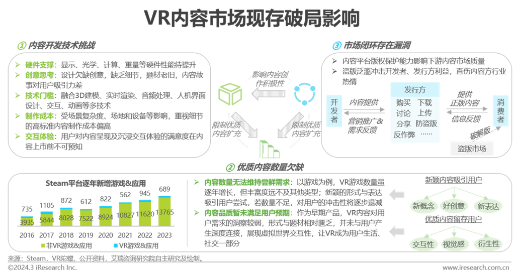 內(nèi)容側(cè):開發(fā)技術(shù)限制優(yōu)質(zhì)內(nèi)容創(chuàng)作輸出,加之內(nèi)容市場環(huán)境成熟度欠缺,優(yōu)質(zhì)正版內(nèi)容難以獲得有效保護(hù),反向沖擊創(chuàng)作者信心,內(nèi)容市場閉環(huán)待完善