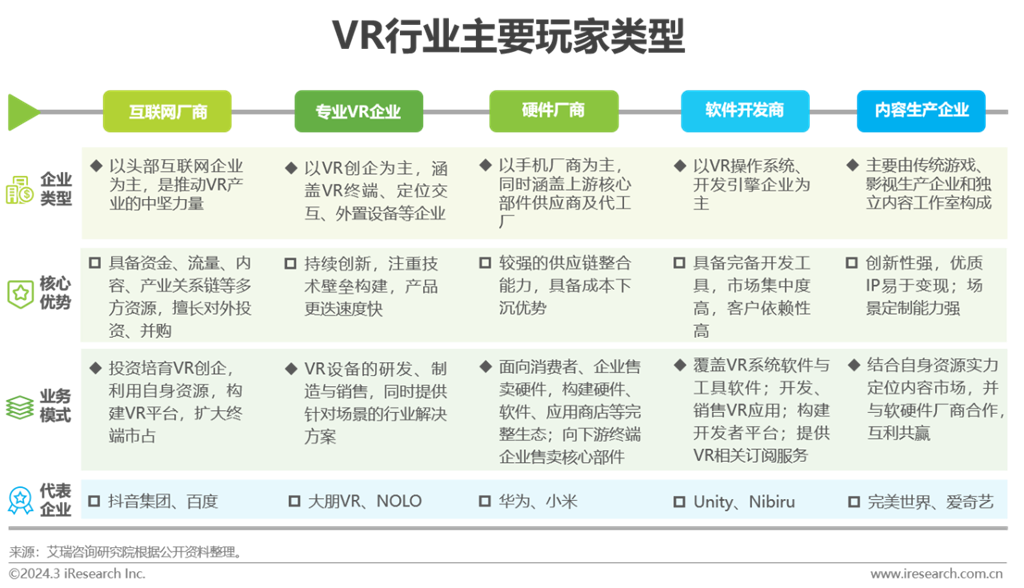 VR行業(yè)參與者類型較為廣泛,貫穿核心硬件、軟件系統(tǒng)、交互技術(shù)、內(nèi)容服務(wù)、頭戴顯示等產(chǎn)業(yè)鏈條各個(gè)環(huán)節(jié)。頭部互聯(lián)網(wǎng)企業(yè)通過投資或自研方式,定位VR行業(yè)潛力企業(yè)與技術(shù)賽道,展開行業(yè)布局并利用自身企業(yè)資源能力,起行業(yè)引領(lǐng)作用。專業(yè)VR企業(yè)為頭顯行業(yè)主力軍,在顯示與配套軟、硬件技術(shù)側(cè)發(fā)力,新品層出疊現(xiàn)。傳統(tǒng)硬件廠商具備供應(yīng)鏈整合優(yōu)勢,入局行業(yè)門檻低,但需要在VR技術(shù)側(cè)不斷積累,以提升產(chǎn)品性能。優(yōu)質(zhì)的內(nèi)容服務(wù)與VR硬件拓展相輔相成,內(nèi)容廠商與軟件開發(fā)商通常具備在對應(yīng)領(lǐng)域豐富積累,VR內(nèi)容創(chuàng)作大多為其新業(yè)務(wù)拓展的一環(huán),目前并非該類型企業(yè)主攻業(yè)務(wù)。