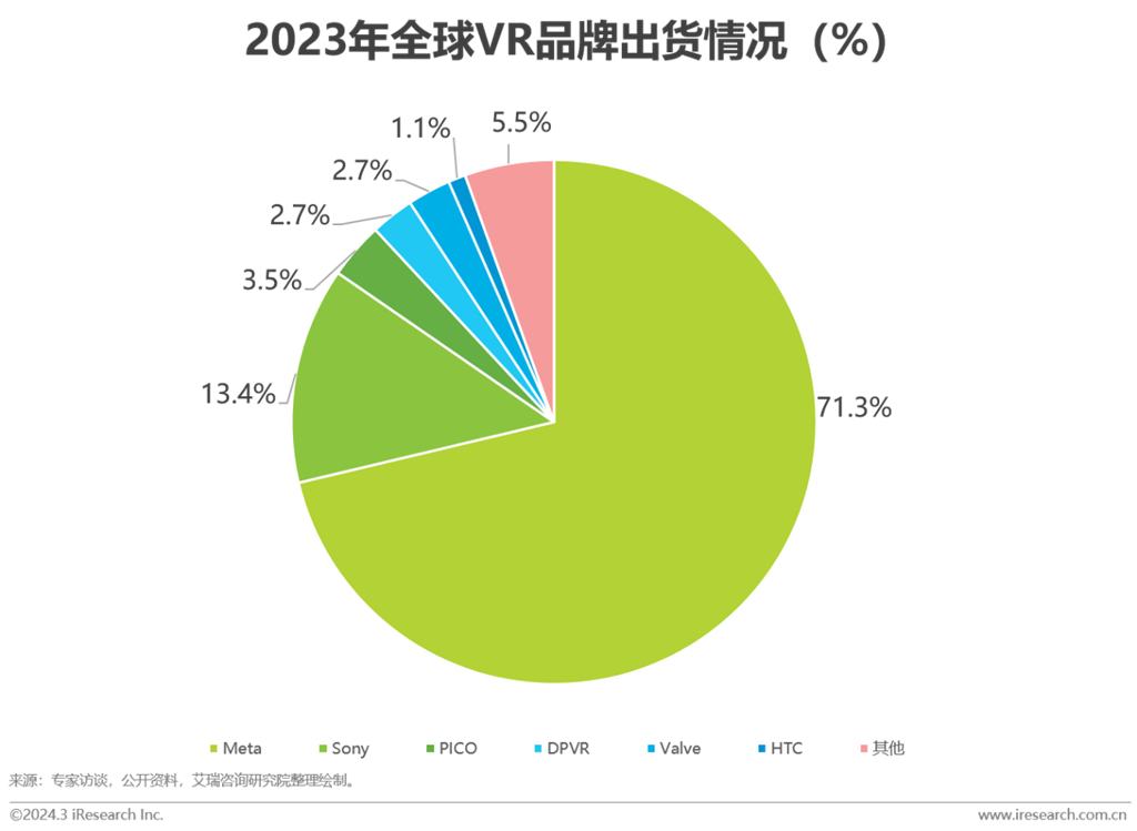 市場規(guī)模:2023年全球VR終端出貨量為765萬臺(tái),其中Meta、Sony、PICO、DPVR和Valve位居前五。艾瑞預(yù)估2024年全球出貨將突破810萬臺(tái)。伴隨生態(tài)成熟與新品迭現(xiàn),特別是蘋果迭代產(chǎn)品對于市場的引爆可能性,艾瑞預(yù)估,2027年全球市場將有飛躍式增長