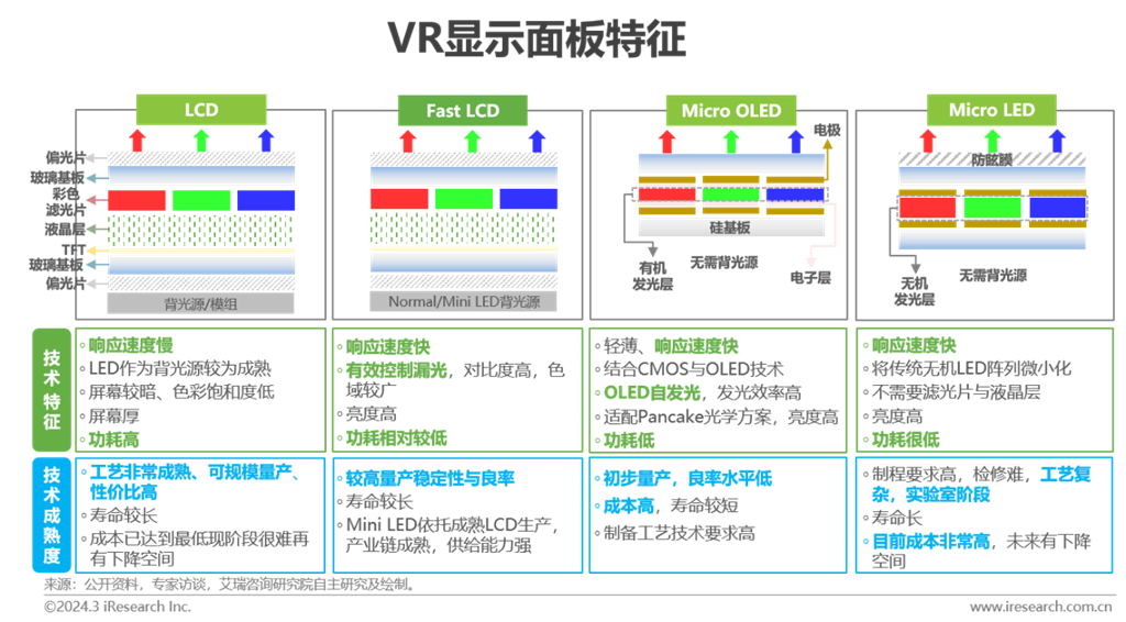 早期VR頭顯大部分采用LCD,礙于LCD響應(yīng)速度慢,從2016年起,玻璃基OLED被嘗試應(yīng)用于VR設(shè)備中。當(dāng)前的VR設(shè)備主要采用Fast LCD屏幕,該類型顯示屏在響應(yīng)速度、量產(chǎn)穩(wěn)定性、良率與成本等方面均有所改善。伴隨顯示方案的步步迭代,2022年起,VR產(chǎn)業(yè)頭部企業(yè)開始研發(fā)帶有Mini LED的Fast LCD顯示面板與Micro OLED面板,以求在對比度、刷新率、亮度、光效等方面獲得進(jìn)一步提升。顯示屏亮度與對比度的提升,更好的適配了Pancake光學(xué)方案對高亮度的需求。值得一提的是,相較于Micro OLED的性能優(yōu)勢,Micro LED在屏幕輕薄度、光效、顯示性能等方案更為出色,目前以蘋果、三星為首的企業(yè)正積極布局,是未來VR顯示面板的理想選擇。