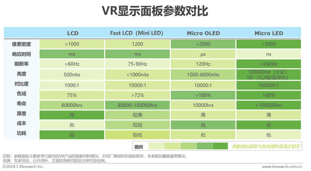 作為VR頭顯近期的主流選擇,F(xiàn)ast LCD(Mini LED)依托全新液晶材料與超速驅(qū)動(dòng)技術(shù),有效提升刷新率至75-90Hz。相較傳統(tǒng)LCD屏幕,F(xiàn)ast LCD兼顧提高屏幕亮度和對比度,增強(qiáng)對暗部區(qū)域顯示的控制,提高飽和度。Micro OLED在分辨率與刷新率方面的優(yōu)勢性能可分別有效緩解紗窗效應(yīng)與余暉效應(yīng),降低眩暈感對用戶體驗(yàn)的負(fù)面影響。盡管OLED長時(shí)間顯示靜止畫面存在燒屏可能,但VR畫面通常會(huì)隨著佩戴者頭部運(yùn)動(dòng)而變化,畫面多數(shù)處于變化中,燒屏問題可得到緩解。Micro LED具備絕對亮度與對比度優(yōu)勢,相同功耗下可提供更長久的續(xù)航。綜合多維度信息,F(xiàn)ast LCD與Micro OLED將在短期內(nèi)不斷滲透,特別是Micro OLED,量產(chǎn)后規(guī)模效應(yīng)下成本將下降。而各維度更勝一籌的Micro LED,待巨量轉(zhuǎn)移和全彩化方案等技術(shù)瓶頸突破后,在VR頭顯有望實(shí)現(xiàn)全面搭載。