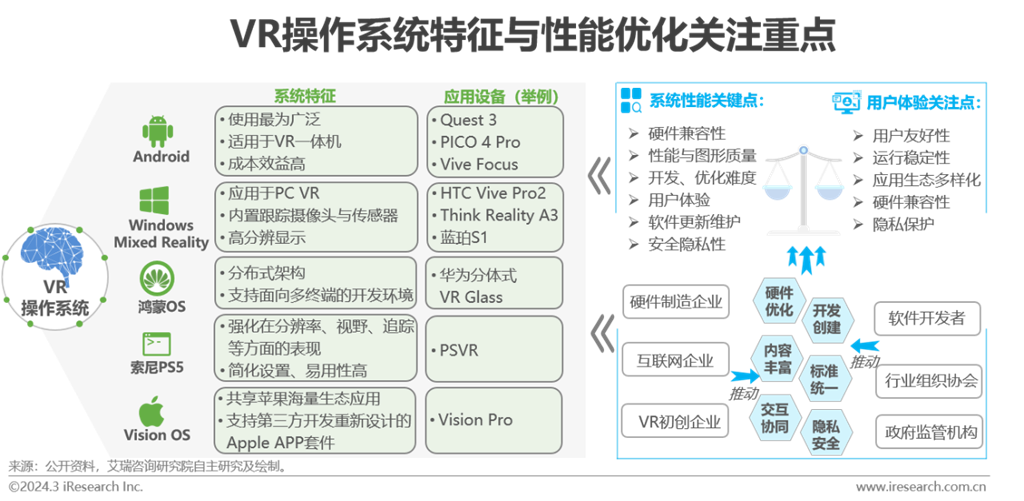 底層的VR操作系統(tǒng)處于虛擬現(xiàn)實(shí)應(yīng)用程序與硬件之間,承擔(dān)管理硬件資源、提供驅(qū)動(dòng)程序支持、處理輸入與輸出,協(xié)調(diào)傳感器數(shù)據(jù)等任務(wù)。早期的VR一體機(jī)基本沿襲了手機(jī)端的計(jì)算芯片與操作系統(tǒng),目前依舊以安卓系統(tǒng)為主,包括部分品牌機(jī)型的深度定制的UI。安卓系統(tǒng)為開源屬性,擁有龐大的開發(fā)者支持,具備跨平臺(tái)兼容性;利用安卓的現(xiàn)成基礎(chǔ),廠商可以自行定制修改,快速推出VR新品。雖然安卓在業(yè)內(nèi)占據(jù)主導(dǎo)地位,但有部分制造商選擇開發(fā)自己的專有系統(tǒng),以滿足特定需求或?yàn)楫a(chǎn)品提供差異化屬性。目前,分體式的VR設(shè)備,包括PC VR、PSVR和華為VR Glass超短焦手機(jī)VR,操作系統(tǒng)以主機(jī)為主,同時(shí)涉及Windows MR、索尼PS和華為鴻蒙OS。蘋果Vison Pro搭載的Vision OS是一款VR/AR操作系統(tǒng),旨在提供沉浸式、交互性強(qiáng)的虛擬體驗(yàn)。Vision OS可兼容iphone和ipad數(shù)十萬款應(yīng)用,并內(nèi)嵌了iOS和空間計(jì)算框架、空間音頻引擎、注視點(diǎn)渲染引擎等。基于多年運(yùn)營的生態(tài)優(yōu)勢,蘋果可擴(kuò)速擴(kuò)張Vision OS,搭建圍繞Vision OS的內(nèi)容與開發(fā)者生態(tài),對整個(gè)XR行業(yè)起拉動(dòng)作用。