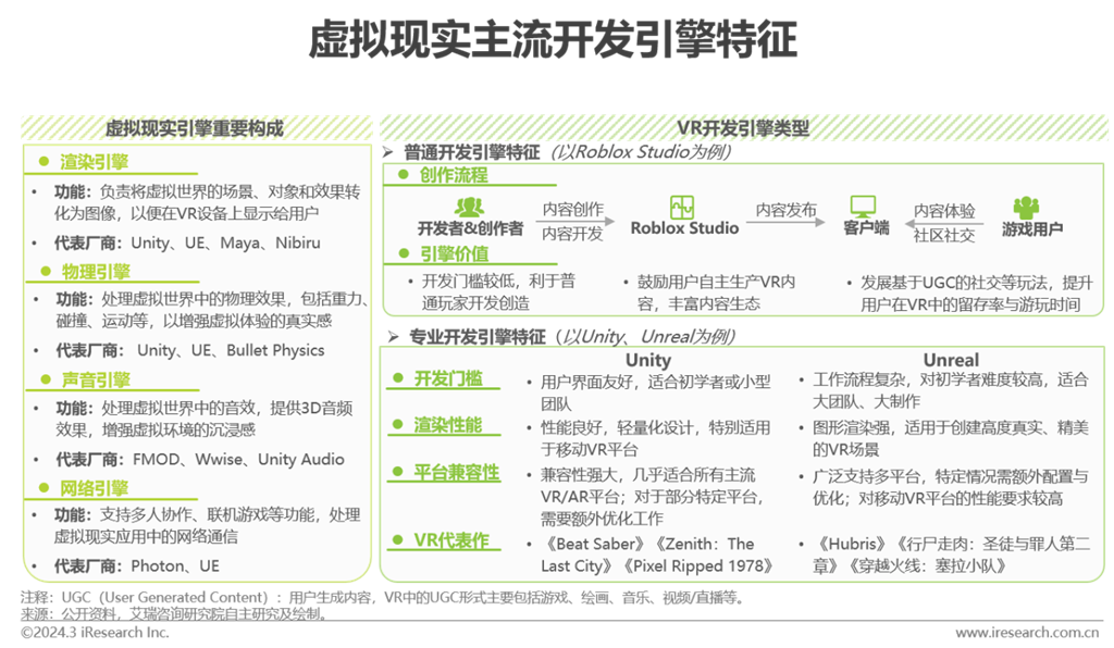 引擎平臺(tái)將軟件系統(tǒng)分解為若干功能模塊,以此來提高軟件開發(fā)效率、降低開發(fā)成本并增強(qiáng)軟件系統(tǒng)的可拓展性。VR產(chǎn)品強(qiáng)調(diào)交互體驗(yàn),開發(fā)前期需要實(shí)驗(yàn)驗(yàn)證,確保核心設(shè)計(jì)點(diǎn)符合VR場景。目前應(yīng)用于VR的開發(fā)引擎以Unity和Unreal為主,在物理模型創(chuàng)建、圖像渲染、系統(tǒng)渲染等方面具備良好性能,因?yàn)樵擃愋烷_發(fā)引擎具備一定使用難度,主要供程序員、開發(fā)者等專業(yè)人員使用。近兩年來VR行業(yè)玩家均在積極推進(jìn)內(nèi)容生態(tài)的構(gòu)建,加之元宇宙產(chǎn)業(yè)的迅速發(fā)展和AIGC刮起的新一輪科技熱潮,企業(yè)鼓勵(lì)普通用戶自主生產(chǎn)內(nèi)容,并提供開發(fā)門檻較低的創(chuàng)作工具,激發(fā)玩家進(jìn)行UGC創(chuàng)作,同步強(qiáng)化內(nèi)容與社交生態(tài)。