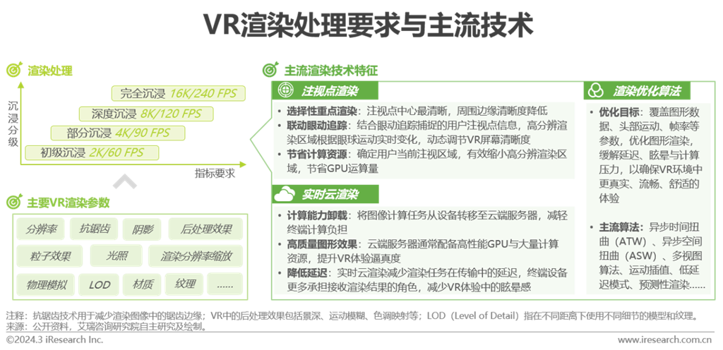 渲染處理主要涉及(1)內(nèi)容渲染:在VR環(huán)境中創(chuàng)建、生成各種元素、場景、對象與效果和(2)終端渲染:對生成的內(nèi)容進(jìn)行畸變、色散等校正并呈現(xiàn)到用戶終端設(shè)備。為匹配用戶的進(jìn)階需求,當(dāng)前的VR渲染處理已跨越初級階段向部分沉浸階段邁進(jìn),在畫質(zhì)、速度、成本等多方面尋求質(zhì)量與效率間的平衡。相較于普通的3D渲染,VR渲染注重用戶體驗(yàn)的全方位性,在幀率、延遲、交互控制、立體聲視圖、性能優(yōu)化等方面均有更高要求。作為連接用戶與虛擬環(huán)境的橋梁,渲染在VR中扮演重要角色,需要高規(guī)格硬件算力設(shè)備、成熟的XR可穿戴智能終端、優(yōu)化的渲染算法及逐步系統(tǒng)化的云渲染模式等技術(shù)的協(xié)同推動(dòng)。當(dāng)前階段,得益于眼動(dòng)追蹤技術(shù)的成熟,注視點(diǎn)渲染吸引更多業(yè)內(nèi)玩家嘗試,如Quest Pro、PS VR 2、PICO 4 Pro等越來越多的VR設(shè)備已在產(chǎn)品中配置。AI算法的成熟應(yīng)用,為渲染模型提供大量圖像、視頻數(shù)據(jù),VR場景質(zhì)量更為逼真。云化架構(gòu)將渲染能力導(dǎo)入云端,云邊協(xié)同有助于降低終端配置成本,改善時(shí)延、抖動(dòng)等問題。在硬件算力仍有不足的情況下,ATW、ASW等優(yōu)化算法也成為VR產(chǎn)品標(biāo)配,以降低虛擬世界的渲染復(fù)雜性,進(jìn)而緩解延遲與滯后。
