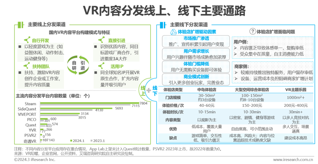 內(nèi)容分發(fā)平臺(tái)打破內(nèi)容碎片化,聚合的豐富內(nèi)容可匹配用戶不同興趣與需求。內(nèi)容分發(fā)渠道分為:(1)線上:由內(nèi)容分發(fā)平臺(tái)主導(dǎo),為用戶提供在線購買、下載和體驗(yàn)服務(wù)。目前線上分發(fā)渠道以各硬件廠商自行搭建為主,暫未出現(xiàn)第三方內(nèi)容分發(fā)平臺(tái)布局。從內(nèi)容數(shù)量角度,國外平臺(tái)占主導(dǎo)地位,其中Steam作為傳統(tǒng)游戲平臺(tái),憑借多年積累優(yōu)勢,VR內(nèi)容數(shù)量一路領(lǐng)跑;國內(nèi)VR應(yīng)用商店加速追趕,盡管內(nèi)容體量仍無法同海外頭部廠商抗衡,但通過自研與引進(jìn)兩種模式,內(nèi)容量快速擴(kuò)充。數(shù)量并非絕對標(biāo)志,但多樣選擇為呈現(xiàn)優(yōu)質(zhì)內(nèi)容提供更大可能。(2)線下:多指B to C線下游藝門店,以VR體驗(yàn)店為主。伴隨疫情開放,線下娛樂由停滯狀態(tài)開始不斷回溫,逐漸受到更多關(guān)注;如能有效緩解用戶與商家側(cè)面臨問題,VR體驗(yàn)店有望成為VR產(chǎn)品出貨的重要支撐。
