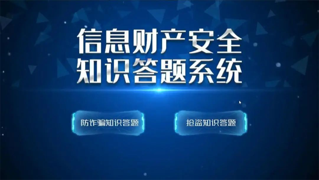 設備待機畫面為“信息則產(chǎn)安全知識答題系統(tǒng)”動態(tài)演繹,下面分為防詐騙知識答題模塊和搶盜知識答題模塊。