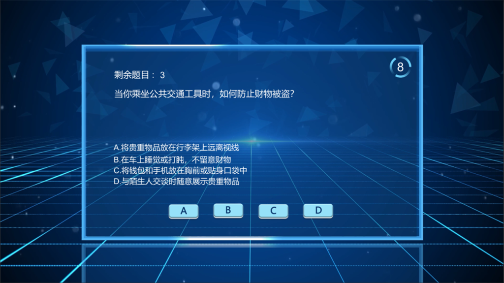 針對搶盜風險,系統(tǒng)以互動答題的形式模擬日常生活中可能遇到的搶劫、盜竊等突發(fā)情況。例如,在公共場所的休息區(qū),如何防止財物被盜,或在公共場所財物被盜等場景。用戶需要在模擬情境中選擇正確的應對措施,系統(tǒng)會根據(jù)用戶的選擇提供實時反饋,幫助用戶學習如何冷靜應對,采取正確的自我保護措施。