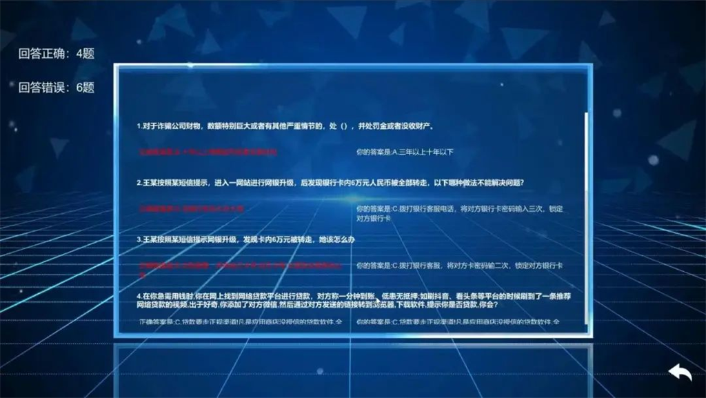 題目涵蓋當前流行的詐騙方式,例如刷單詐騙、冒充微信、投資理財,通過簡單的互動答題提高預防意識。整個體驗流程以互動答題的形式展開,玩家需要從多個選項中選擇正確選項,體驗完系統(tǒng)會給出評分和實時反饋,幫助用戶識別詐騙套路。用戶不僅可以通過答題學習詳細的詐騙知識,還能在互動中掌握全面的防范措施和安全建議,例如如何保護個人信息、避免上當受騙等。