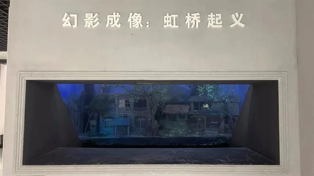 幻影成像系統(tǒng),呈現(xiàn)虹橋起義的內(nèi)容展現(xiàn)。利用多機多方位攝像技術(shù)及人眼視覺心理特性,再將所拍攝區(qū)域?qū)⑼队爱嬅嫱渡湓谔刂泼浇椴A?,與實景模型結(jié)合,合成最終3D畫面,演繹出虹橋起義故事。